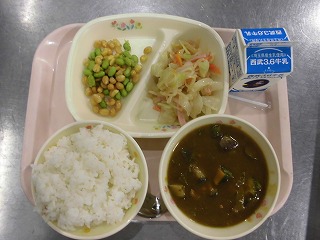〈献立名〉牛乳、夏野菜のカレーライス(学校炊飯:白飯)、おまめのカリカリ揚げ、大根サラダ