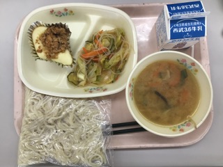 味噌ラーメン・手作り肉まん風蒸しパン・中華サラダ・牛乳