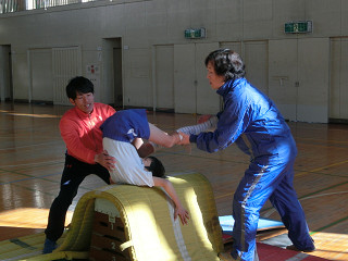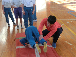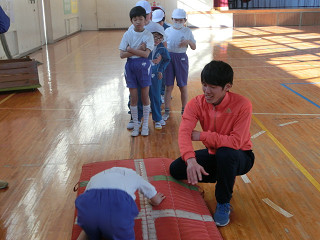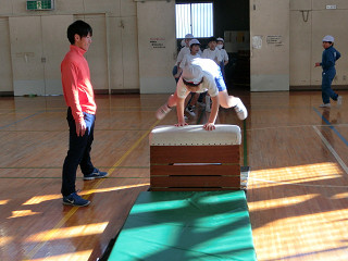 スポーツマンの土居先生は、マット運動や、跳び箱運動の