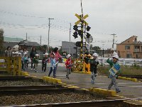 安全に気をつけて渡ります。川本北小学校は、鉄道が近くにある学校です。一人一人が、自分の目で確かめられるように練習します。