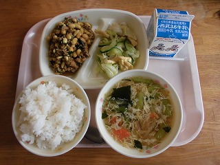 今日の給食には、『にらのソイ丼』☆体に良い大豆がたっぷり入った献立です。含まれるオリゴ糖には、腸内の善玉細菌であるビィフィズス菌を、活発にする働きがあります。レシチンも含まれており、脳細胞を活性化させるので、記憶力や集中力を高めると言われています。
