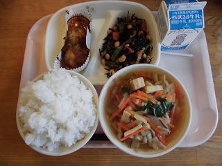 今日の給食には、『大豆の磯煮』☆子供達はあまり得意ではない、乾物の煮物のひじきですが、食物繊維やビタミン、ミネラルが多く含まれています。厚焼き玉子に入れるなど、工夫すると食べやすくなります。お弁当の彩りにも◎