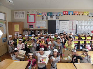 学校探検を行いました。学習したひらがなを学校の中で見つけていろいろな教室を探しました。隠れているひらがなをつなぎ合わせるとある言葉ができます。目をキラキラさせてがんばっていました。