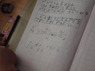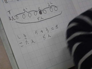 その後は、類似問題について考え、となりの人とペアで説明しあうことができました。「僕は、・・と式を立てました。5という数字はここからここまでの人数で、これは私です。・・・。だから、全部で10人です。」日頃から、式と図を関係づけることを子どもたちに意識させて問題を解かせている様子がよくわかりました。「1年生でも、これだけ説明できるのだなあ。」と感心させられました。