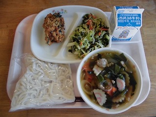 〈献立名〉牛乳、肉うどん、ほうれん草のかき揚げ、和風サラダ