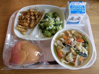 〈献立名〉牛乳、フラワーロール、大豆とポテトの揚げ煮、グリーンサラダ、煮ぼうとう