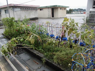 残念ながら、花だんのお花たちが倒れてしまいました。