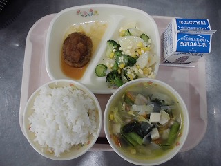 〈献立名〉牛乳、ごはん、おろしハンバーグ、ポテトとチーズのさっぱりサラダ、豆腐と野菜のコンソメスープ