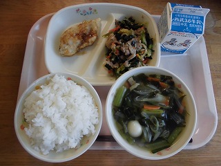 〈献立名〉牛乳、白飯、白身魚の南蛮漬け、豚肉とアレッタのオイスターソース炒め、わかめスープ
