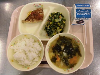 〈献立名〉牛乳、ごはん、あじの南蛮漬け、ほうれん草とコーンのソテー、あさりと豆腐の味噌汁