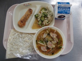 〈献立名〉牛乳、サンマーメン(ホット中華麵)、アメリカンドッグ、大根とジャコのサラダ