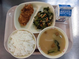 〈献立名〉牛乳、カツ丼(白飯)、骨まるごとおかか和え、なめこ汁