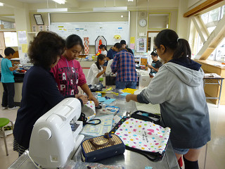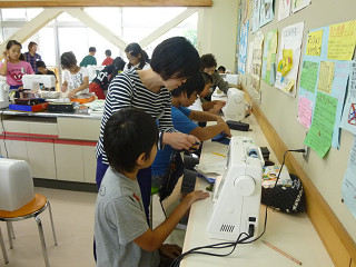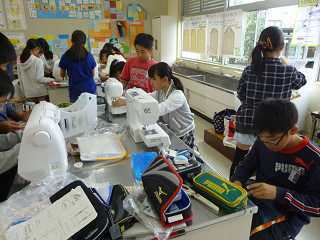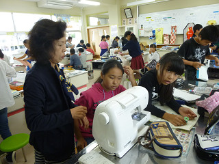 ミシンボランティアの皆様に協力してもらい、子どもたちは上手に