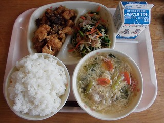 〈献立名〉牛乳、ごはん、鶏肉と高野豆腐の甘辛だれ、もやしの中華サラダ、サンラータン