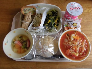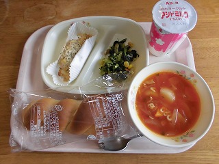 今日の給食には、赤や緑などの鮮やかなメニューが並びます。ねじねじがかわいい、ツイストパンも久しぶりです。『ミネストローネ』には、アルファベットのマカロニが入ったので、子供達は楽しそうにスープをかき回していました。
