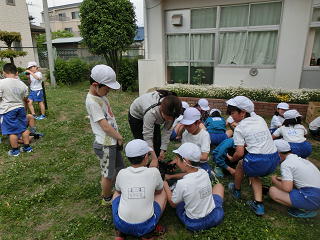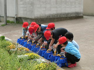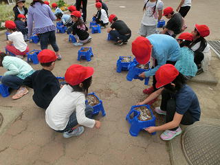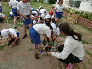 1年生があさがおの種を、3年生がホウセンカの種をそれぞれ植えていました。一人一鉢、大切に育てながら、しっかり観察してほしいものです。<1年生><3年生>
