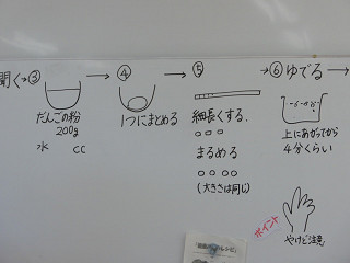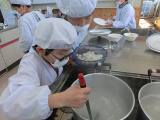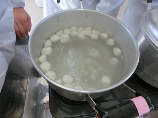 熱湯の入った鍋に入れるときの注意を説明してから、団子を