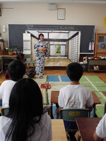 「書院造り」の背景・「掛け軸」・「生け花」・「ござ」を用意し、教室を「和」の