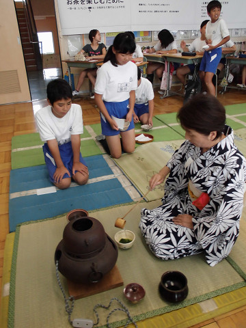 全体に説明しています。   飲む前に「茶筅」で混ぜます。  「茶釜」も用意しました。