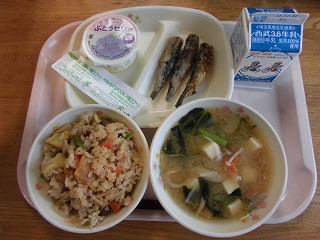 〈献立名〉牛乳、秋の香り御飯(茶飯)、いわし唐揚げ、きのこ汁(みそ仕立て)、ぶどうゼリー
