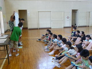来年修学旅行に行く5年生を招いて、体育館で行いました。
