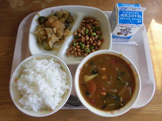 〈献立名〉牛乳、冬野菜のカレーライス(学校炊飯:白飯)、大豆と枝豆のカリカリ揚げ、手作り福神漬け