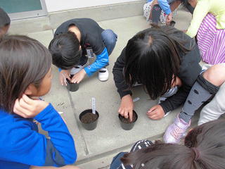4年生は「雨水と地面」の学習で、水のしみこみ方を調べる実験を行いました。