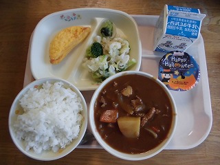 〈献立名〉牛乳、ハヤシライス(白飯)、オムレツ、花野菜のサラダ、ハロウィンデザート(ミックスベリープリン:アレルゲンなし)