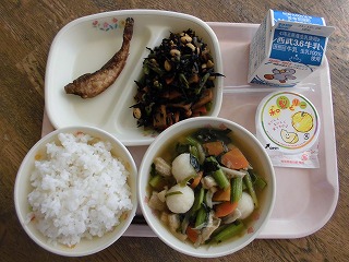 〈献立名〉牛乳、白飯、ハタハタの竜田揚、大豆の磯煮、だまっこ鍋、なしゼリー