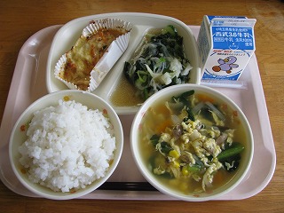 今日の給食には、『コーン入り華風スープ』☆作り方を生徒に聞かれたこともある、人気のスープです。彩りのよい具材でスープにとろみをつけて、溶き卵を流し入れる中華スープです。持参できるレシピを、図書室の壁面に掲示してあります。