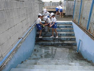 4年生は「雨水と地面」の学習で、水のしみこみ方を調べる実験を行いました。