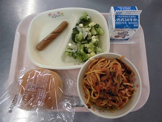 〈献立名〉牛乳、はちみつパン、ウィンナー、チーズサラダ、トンノスパゲティ