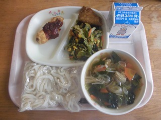 〈献立名〉牛乳、きつねうどん(地粉うどん)、アメリカンドッグ、小松菜とジャコの炒り煮