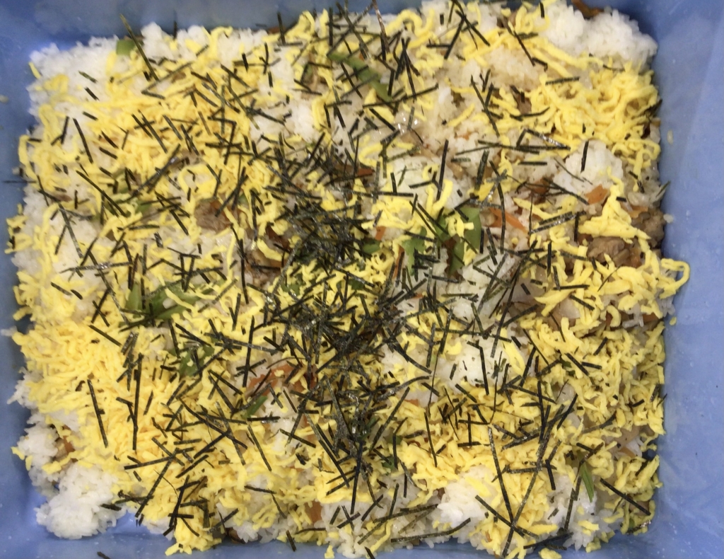 今日はひなまつり給食です。彩りきれいなちらし寿司と、すまし汁には梅の花の麩を入れました。