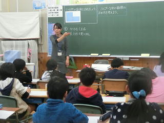 子どもたちの元気なあいさつで始まった授業は、先生の問いかけに子ども達が答えながら、課題設定、見通しをもつところまでテンポよく進みました。自力解決では、どの子も自分で方法を決め答えを導き出すことができました。その後、友達とペアやグループで交流することを通して、さらに別の方法についても理解することができました。
