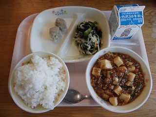 〈献立名〉牛乳、白飯、蒸しシュウマイ、大根とジャコのサラダ、四川麻婆豆腐