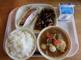 〈献立名〉牛乳、ごはん、鮭の生姜焼き、大豆の磯煮、重忠汁
