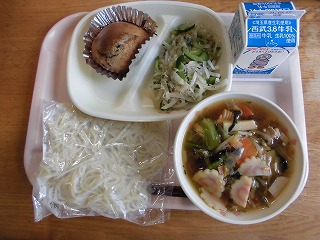 〈献立名〉牛乳、サンマーメン(ホット中華麵)、ブルーベリーパンケーキ、ジャコ入り大根サラダ