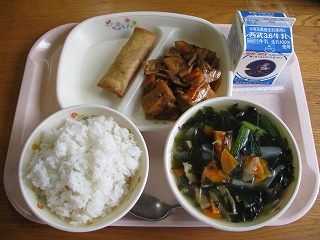 〈献立名〉牛乳、白飯、春巻き、ジャージャンドウフ、中華スープ