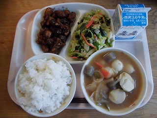 市内で唯一、週に一度の自校炊飯を行っています。炊きたてのごはんは味もよく、みんな自校炊飯の日を楽しみにしています。