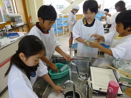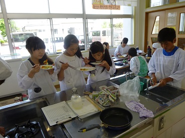 6年生になって、初めての調理実習がありました。旬の野菜を使って、野菜炒めを作りました。グループ毎に協力して、野菜を切ったり炒めたりしました。キャベツやにんじん、ピーマンの彩りのきれいな野菜炒めを作ることができました。さすが6年生、最後の片付けまで手際よく行うことができました。グループによっては、少ししょっぱかったり、辛めだったりしたようですが、油や調味料の使い方を知るよい勉強になりました。