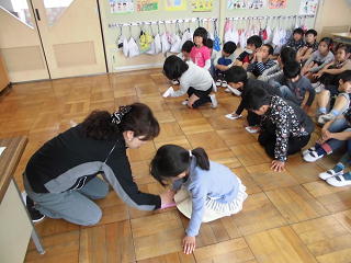 学校探検を行いました。学習したひらがなを学校の中で見つけていろいろな教室を探しました。隠れているひらがなをつなぎ合わせるとある言葉ができます。目をキラキラさせてがんばっていました。