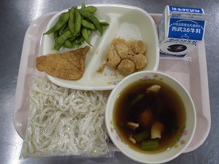 〈献立名〉牛乳、きつねうどん(地粉うどん)、白玉団子のきなこあえ、枝豆