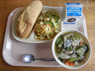 〈献立名〉牛乳、きな粉揚げパン(コッペパン)、春キャベツとじゃこチーズのサラダ、わんたんスープ