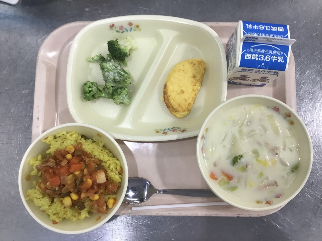 今日は深谷市の友好姉妹都市、アメリカカリフォルニア州フリーモント市にちなんだメニューです。ジャンバラヤは本来辛いのですが、給食のは食べやすいようにアレンジしています絵文字:笑顔