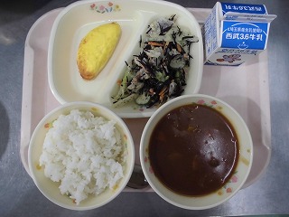 〈献立名〉牛乳、ハヤシライス(学校炊飯:白飯)、オムレツ、ツナとひじきのサラダ