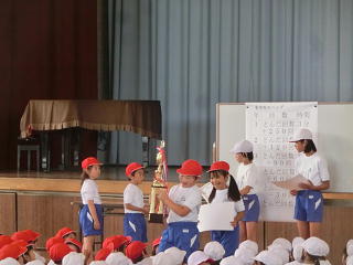 今日の業間休みを使って、校内長縄大会を行いました。低・中・高学年ごとに、それぞれ3分間の8の字跳びで回数を競いました。回数ではさすが6年生が1番跳びましたが、ハンデがあったので、1~3位は1年生がとりました。