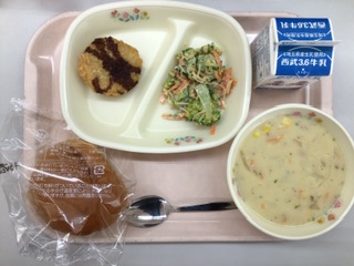 コロッケサンド・冬野菜のマヨ醤油和え・コーンシチュー・牛乳