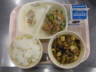 〈献立名〉牛乳、ごはん、麻婆なす豆腐、ポークしゅうまい、春雨サラダ