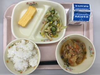 ご飯・厚焼き玉子・お揚げのサラダ・じゃがぶたキムチ・牛乳